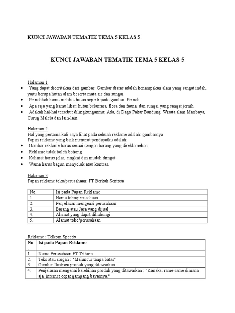 Kelas 5 Sekolah Dasar Kunci Jawaban Tematik Kelas 5 Tema 1